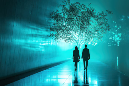 Two people stroll side by side along a glowing pathway toward a luminous tree under the night sky.