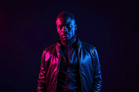 Young african male in leather jacket with neon lighting.