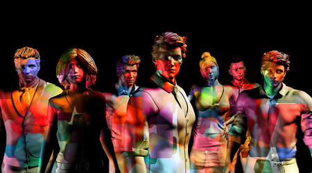 An AI generated illustration of An abstract image of a group of individuals standing in a row against a backdrop of blue and purple light