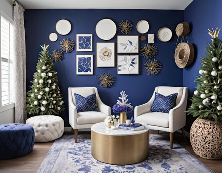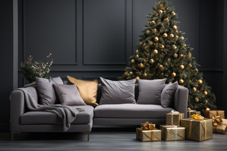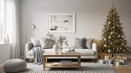 Living room decorated for Christmas with trees, gifts, walls, posters, canvas, full screen mockup, paint, frames. by Generative AI