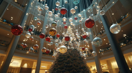A stunning display of holiday decorations features a beautifully adorned Christmas tree and shimmering ornaments hanging from the ceiling in a shopping center.