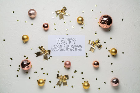 Text HAPPY HOLIDAYS and Christmas decor on light background
