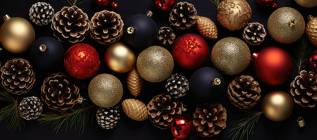 Christmas and New Year background with golden and red baubles, pine cones and fir branches on black background