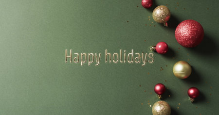 Happy holidays text with glittery christmas baubles on green background. Christmas, decorations, tradition, greetings and celebration digitally generated image.