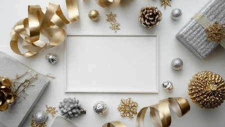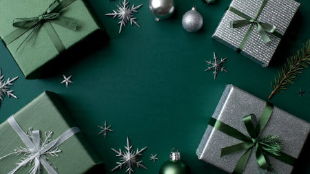 Bright Christmas mockup with cool green tones, framed by silver decorations that reflect soft lighting.