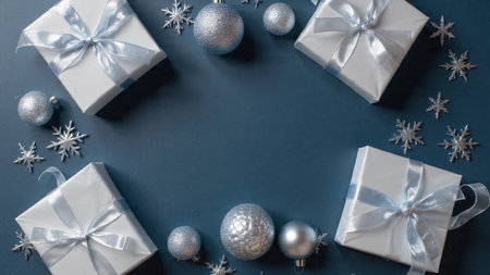 A premium flat-lay Christmas composition featuring white gift boxes wrapped in glossy red ribbons arranged along both edges of a textured sapphire-blue background with scattered silver ornaments and snow dust.