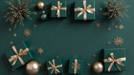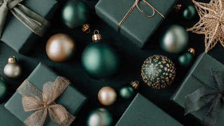 Premium holiday composition with matte green ornaments and polished metallic gold.