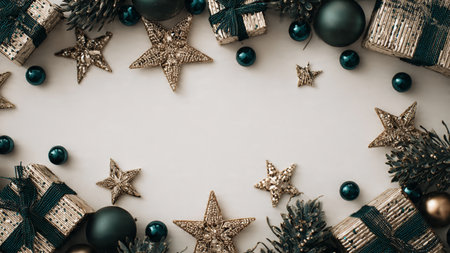Minimal festive border featuring soft pine textures and delicate metallic ornaments.