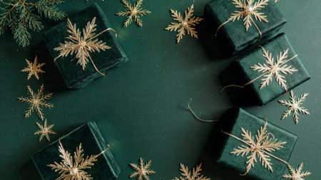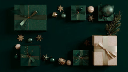 Sleek modern Christmas mockup with deep green matte surfaces and sharp gold highlights.