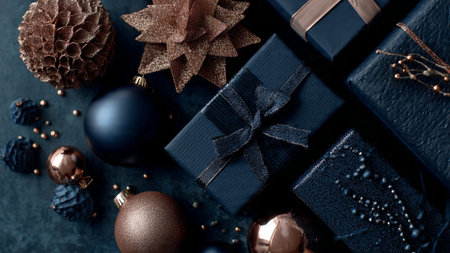 A refined winter setup featuring matte midnight-blue textures complemented by glowing rose-gold ornaments.