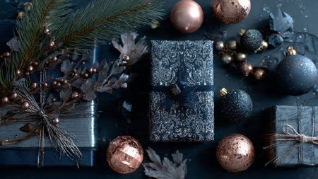 A moody vintage holiday composition with textured midnight-blue surfaces, antique rose-gold ornaments, and rustic ribboned presents.