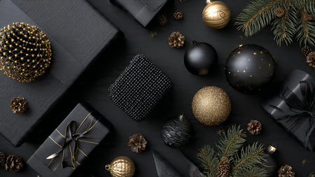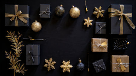 A curated series of gold ornaments arranged artistically over matte-black surfaces.
