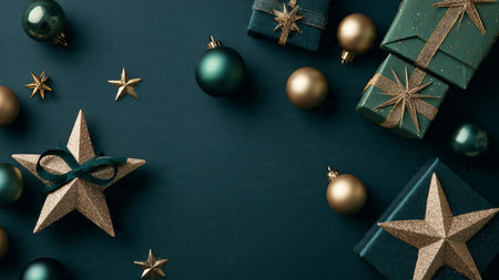 Premium top-view winter mockup combining high-shine gold decorations with rich emerald tones.