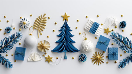 Modern Christmas cards, posters, holiday covers, banners and banners with golden blue and white gifts, pine branches, and lights.