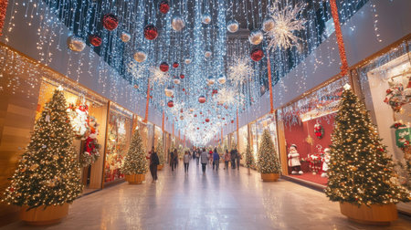 Experience the magic of Christmas in this beautifully decorated walkway, featuring twinkling lights, festive trees, and joyful shoppers celebrating the season.