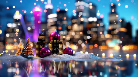 A captivating nighttime scene featuring a miniature cityscape adorned with colorful Christmas ornaments and a touch of snow, exuding festive cheer.