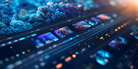 Futuristic video editing interface with vibrant visuals on a high-tech screen, symbolizing digital creativity, multimedia production
