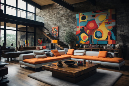 The interior of the modern living room is with sofa, coffee table and colorful wall painting.