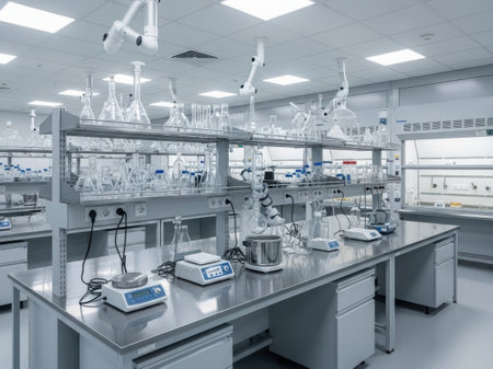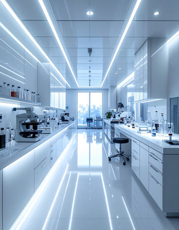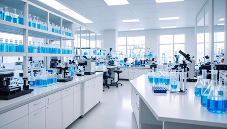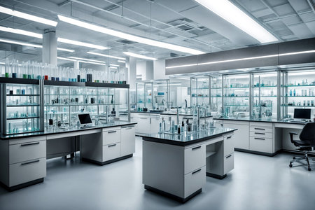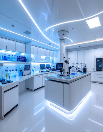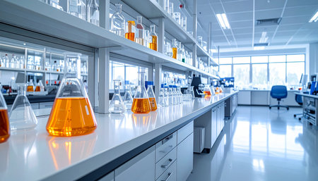 A bright and modern laboratory filled with various glassware and scientific equipment. Ideal for themes of research, experimentation, and innovation in science.