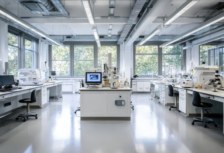 Spacious laboratory with various workstations and high-tech equipment, illuminated by natural light from large windows, fostering a productive research atmosphere