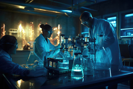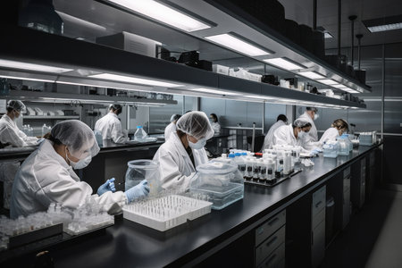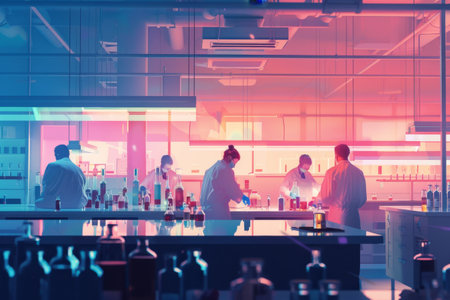 A group of scientists are working collaboratively in a lab, conducting experiments and analyzing results, A laboratory setting with scientists testing new medications