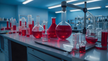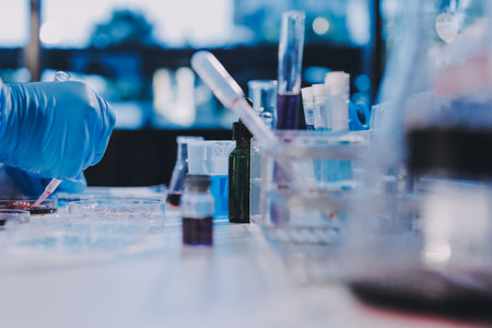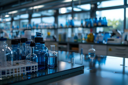 Laboratory glassware and chemical liquids in a modern scientific laboratory.