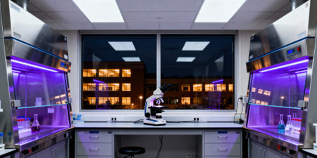 Modern laboratory setup with a central microscope, illuminated workstations with purple lighting, and a large window showcasing city buildings at night. Clean and organized workspace.