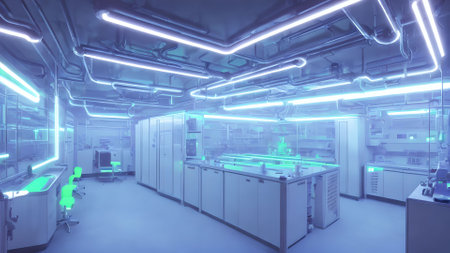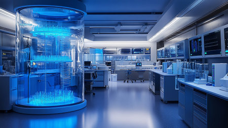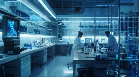 A modern laboratory scene showcasing scientists engaged in research and experiments. The advanced setup emphasizes technology and innovation in the scientific field.