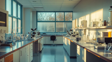 A well-organized laboratory is equipped with glassware and a microscope, illuminated by natural light streaming through large windows, showcasing a productive research environment.