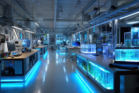 A modern laboratory interior with blue lighting and aquariums built into the counters
