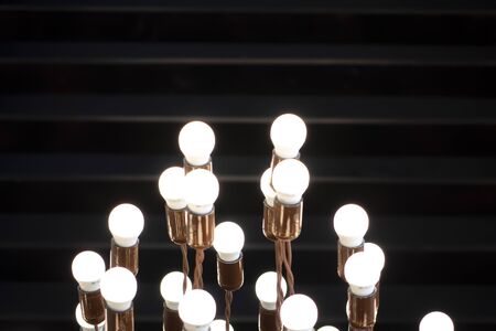 Set of incandescent lamp bulb hanging from the wall against a white brick wall. Large decorative art of lightning. Home decoration concept.