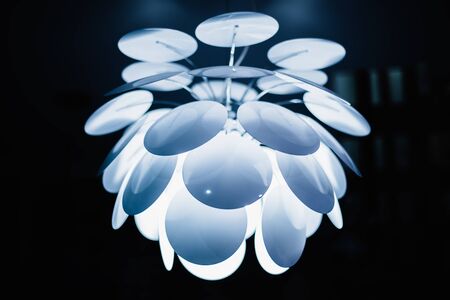 modern chandelier with LED lamps hanging on the ceiling in the interior of the room inside the house, design of home, warm light from shades.