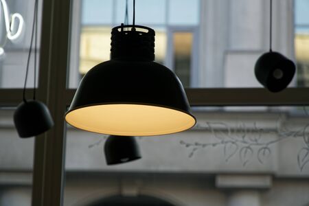 Yellow retro cafe lights on the background of blue window and black roof with reflections in it. interior design loft style modern vintage decoration. Night in empty caffee or coffee shop.