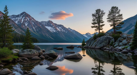 A tranquil mountain landscape featuring a calm lake surrounded by lush trees and stunning peaks. The serene reflection on the water enhances the natural beauty, inviting exploration.