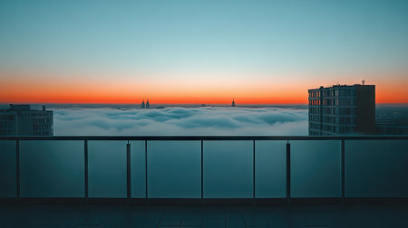 Aerial view of a city skyline at sunrise, with a thick layer of clouds filling the horizon. A glass balcony or deck is in the foreground, providing a perspective to the scene.