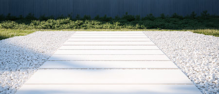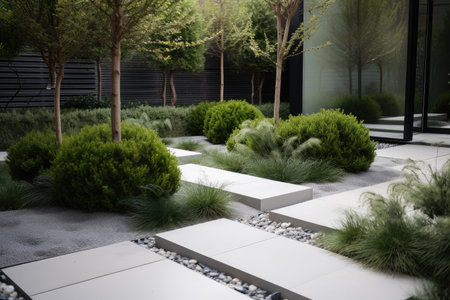modern garden with sleek stepping stones and minimalist planting, created with generative ai