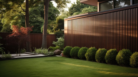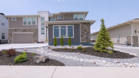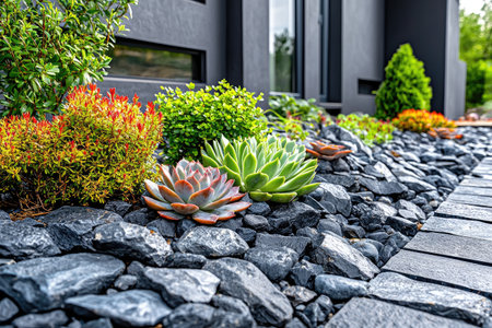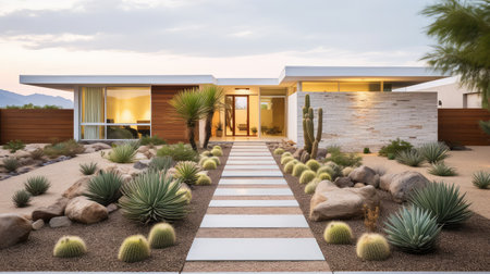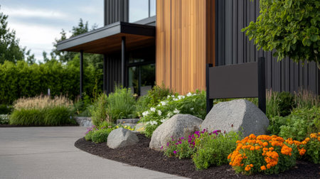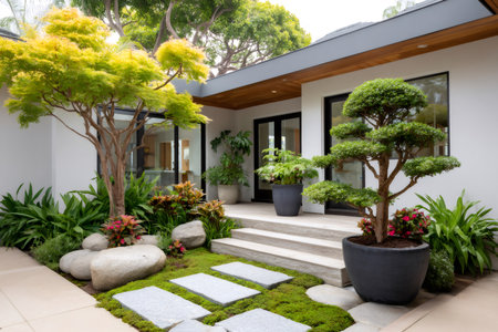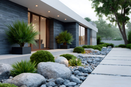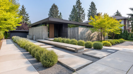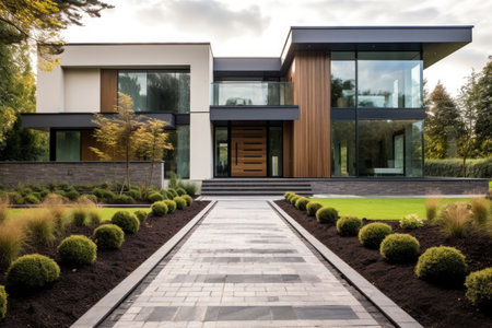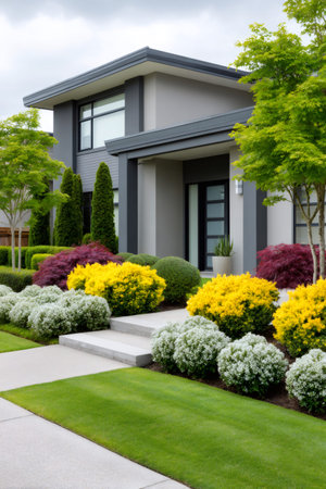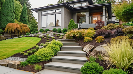 In front of a semi-modern house is maintenance-intensive landscaping. Generative AI image captured directly at the residence