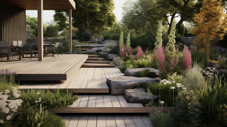 a landscape design juxtaposing natural and manmade materials, created with generative ai