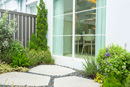 Small gardens with beautiful different green flower and plant in home backyard garden.