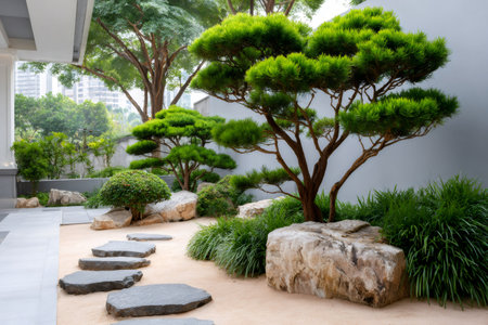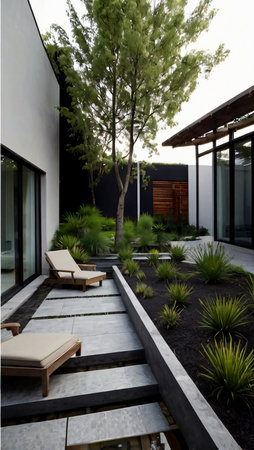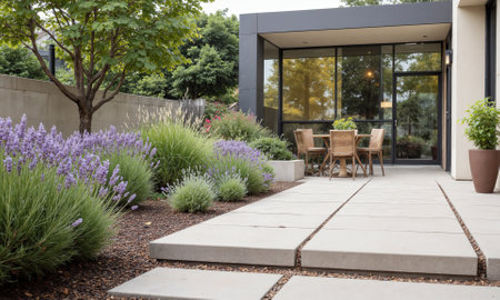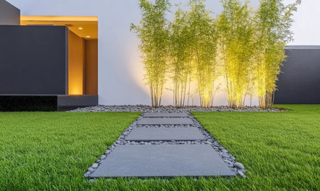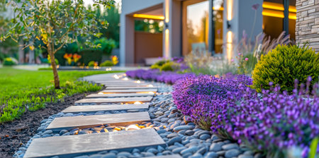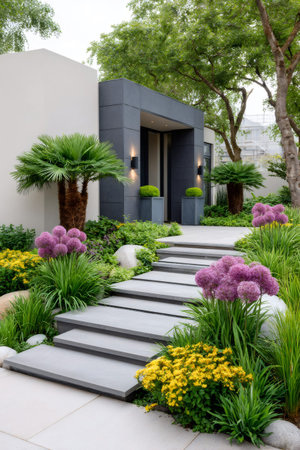 garden that blends natural elements with modern design, featuring a stone pathway.
