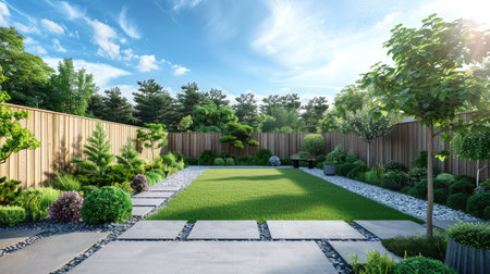 Explore a captivating garden landscape featuring vibrant flowers, lush green grass, and scenic trees bathed in sunlight. A perfect retreat for nature lovers.