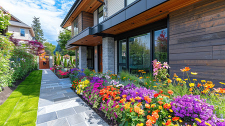 Vibrant flower beds lining the pathway leading to the front door of a modern house, creating a welcoming and lively entrance.