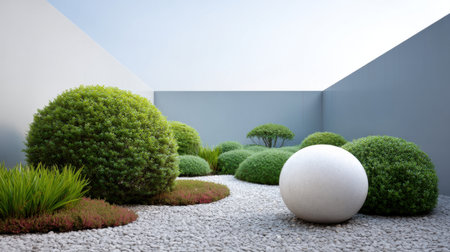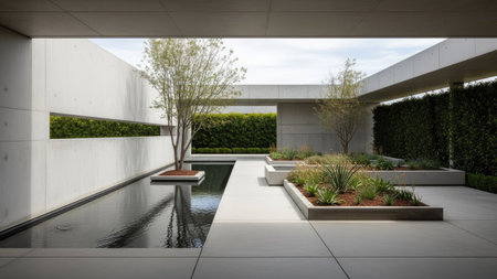 A minimalist outdoor courtyard showcasing clean lines, geometric shapes, and modern landscaping elements. Ideal for design inspiration and tranquil environments.
