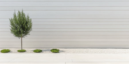 A single green tree stands beside neat bushes on a gravel patch, set against a smooth, light-colored wall. The design showcases simplicity and tranquility in outdoor spaces.