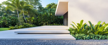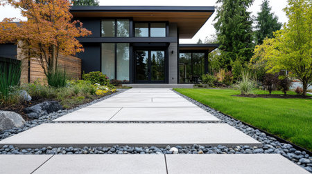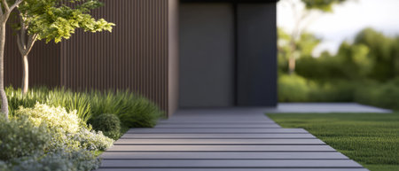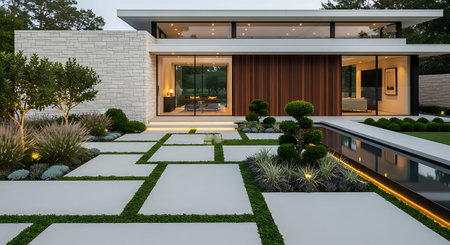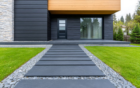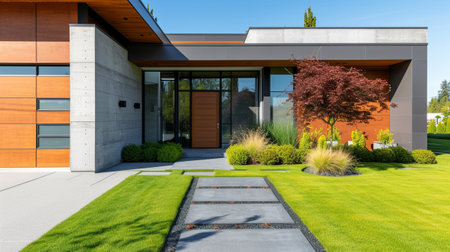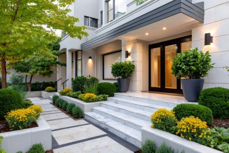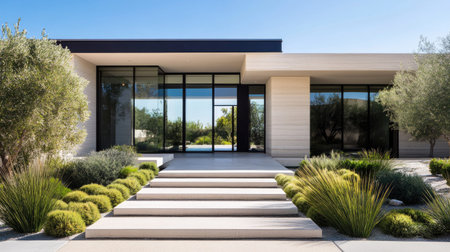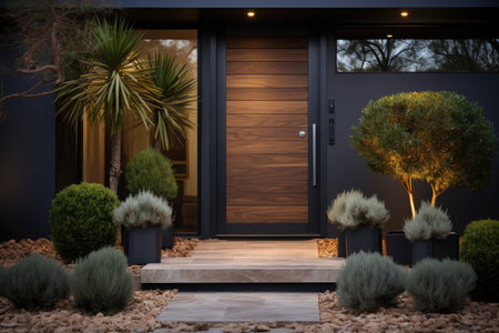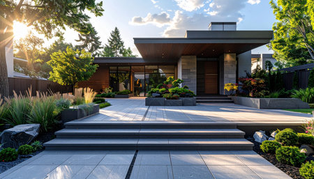 A modern home entrance surrounded by lush landscaping, with sleek design and a pathway leading the way, creating a stylish and welcoming environment.