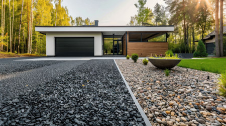 A serene garden pathway showcases smooth black stones along a gravel border, leading to a contemporary home. Lush green grass and trees enhance the tranquil atmosphere during sunset.