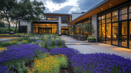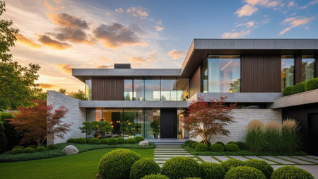 Beautifully designed garden beds showcase variety of plants, including colorful flowers and lush greenery, set against modern home with large windows and stunning sunset backdrop