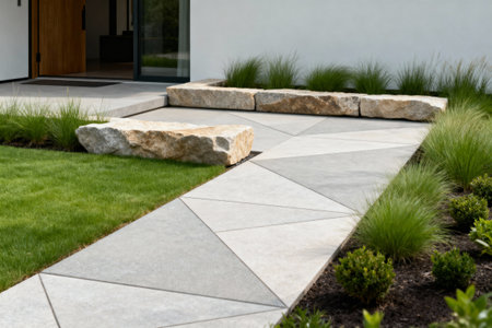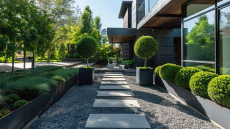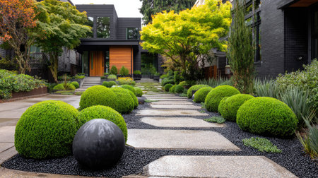 Explore a stunning modern landscape featuring a unique stone pathway lined with lush greenery and round shrubs, creating a tranquil and inviting residential atmosphere.