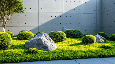 A serene zen garden features a minimalist stone planter filled with vibrant greenery, set against a smooth concrete wall, perfect for modern landscape designs.