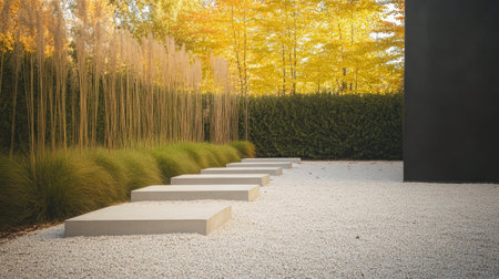 The image features a contemporary garden with wide concrete stepping stones leading through white gravel, surrounded by tall grasses and vibrant autumn trees.